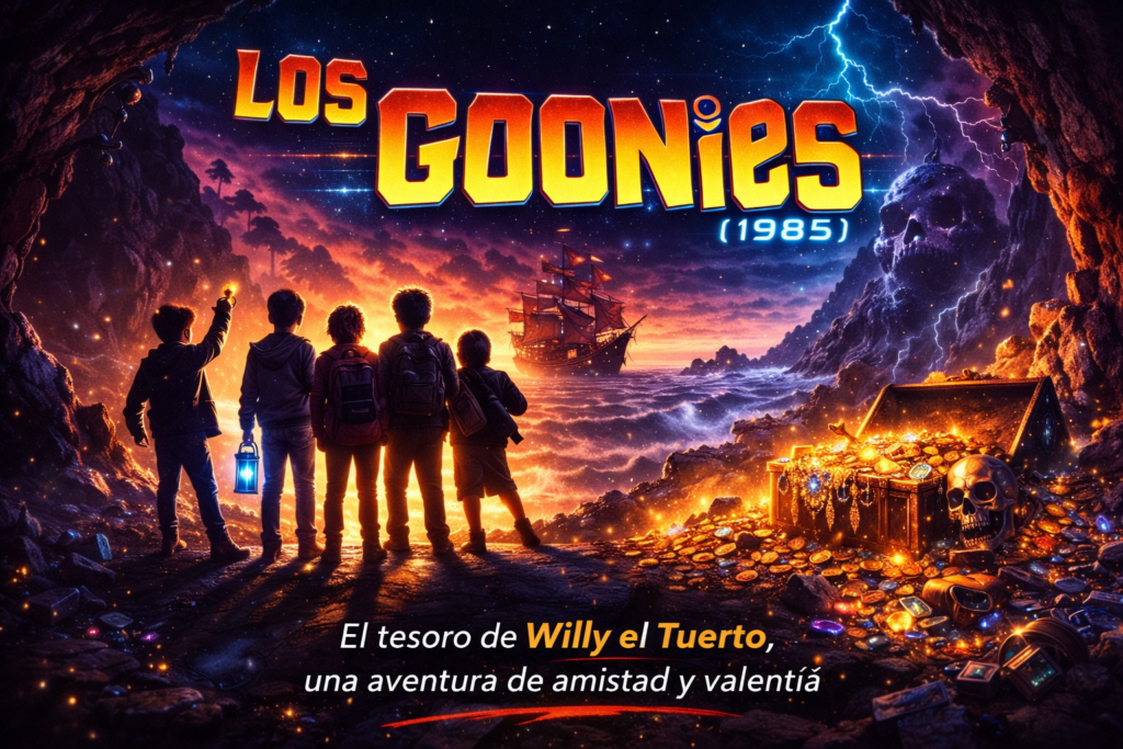 Los años 80 nos enseñaron que la verdadera aventura empieza con amigos y un mapa del tesoro. Entre cuevas secretas, trampas y el mítico tesoro de Willy el Tuerto, esta historia se convirtió en un himno a la imaginación y la amistad.